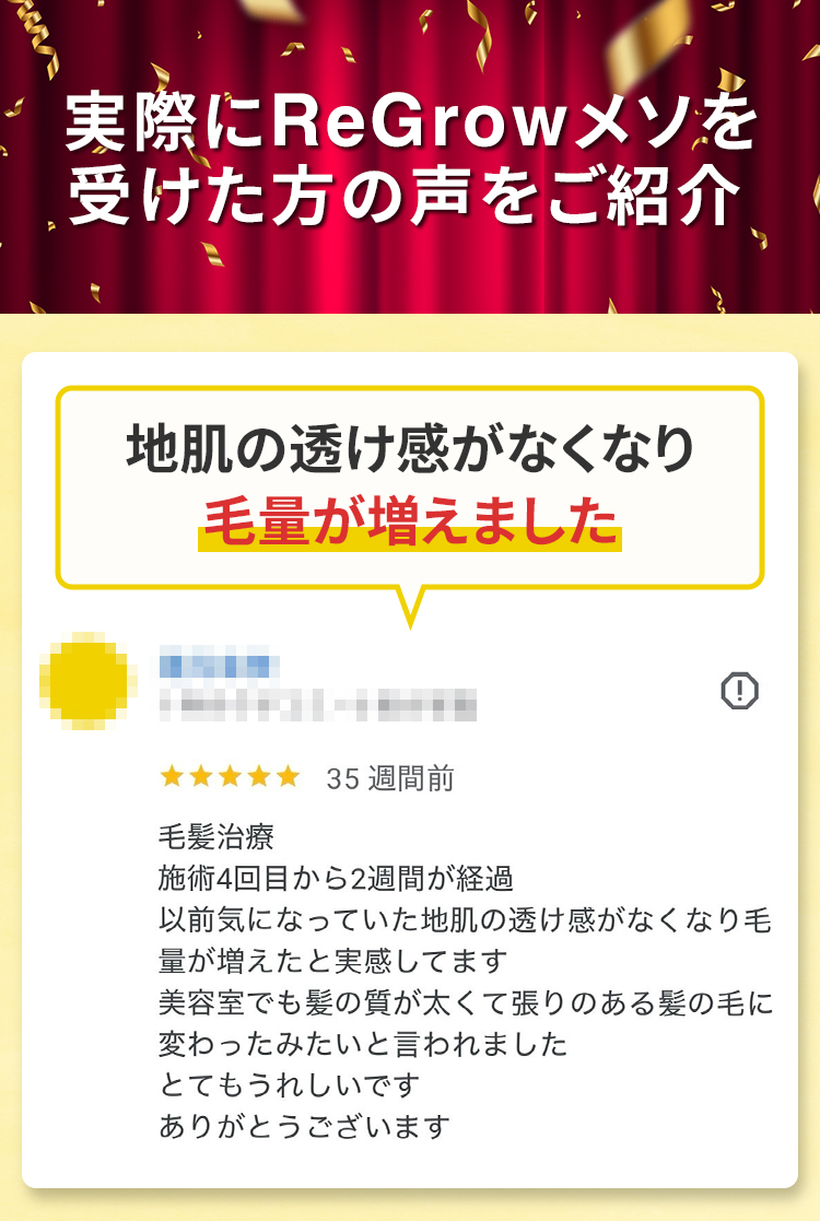 症例写真で効果のイメージを掴んでいただいたあとは、実際にReGrowメソを受けられた方のリアルなお声をご紹介します。