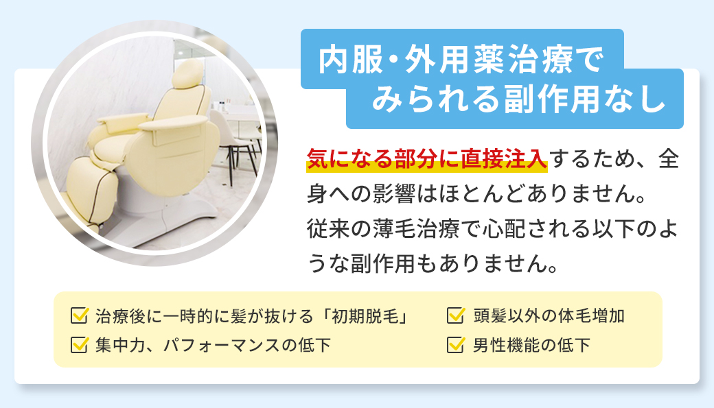 男性ホルモンを抑える内服薬とは異なり、初期脱毛・性欲減退・体毛増加などの副作用の心配がありません。
