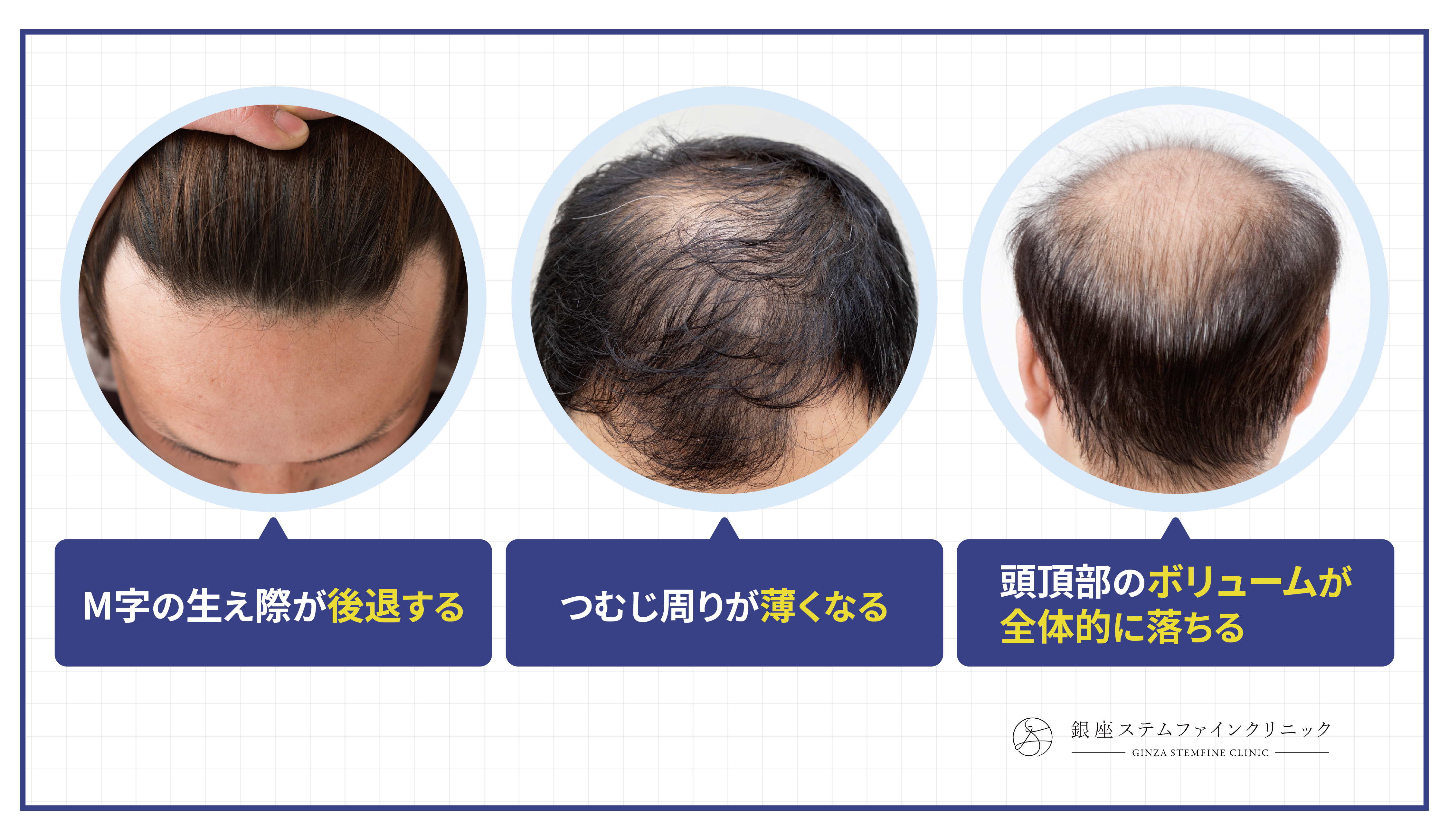 その結果、髪が細く弱々しくなる産毛のような毛ばかりになる、ボリュームがどんどん落ちるという流れで、目に見える薄毛へとつながっていきます。
