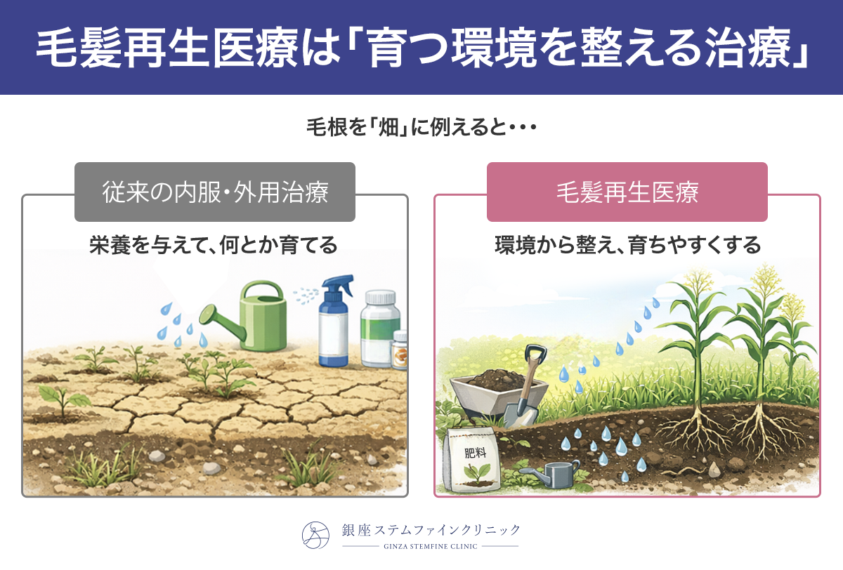 再生医療は、毛根そのものの環境を整える治療のため、