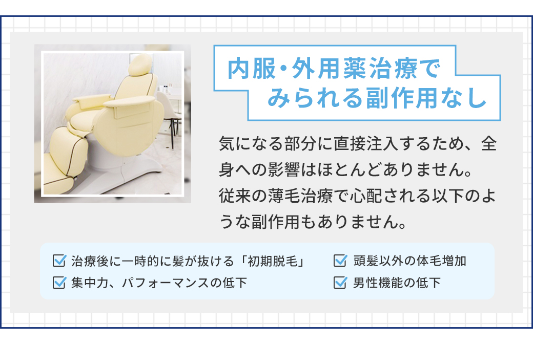 そのため、治療を中止すると、治療で回復しつつあった細い毛から先にボリュームが落ちていくと考えられています。5