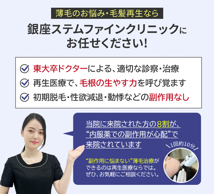 治療に使用する幹細胞は、もともと私たちにの身体の中にある細胞のため、全身に影響する副作用の心配がいらないのが毛髪再生治療のメリットです。