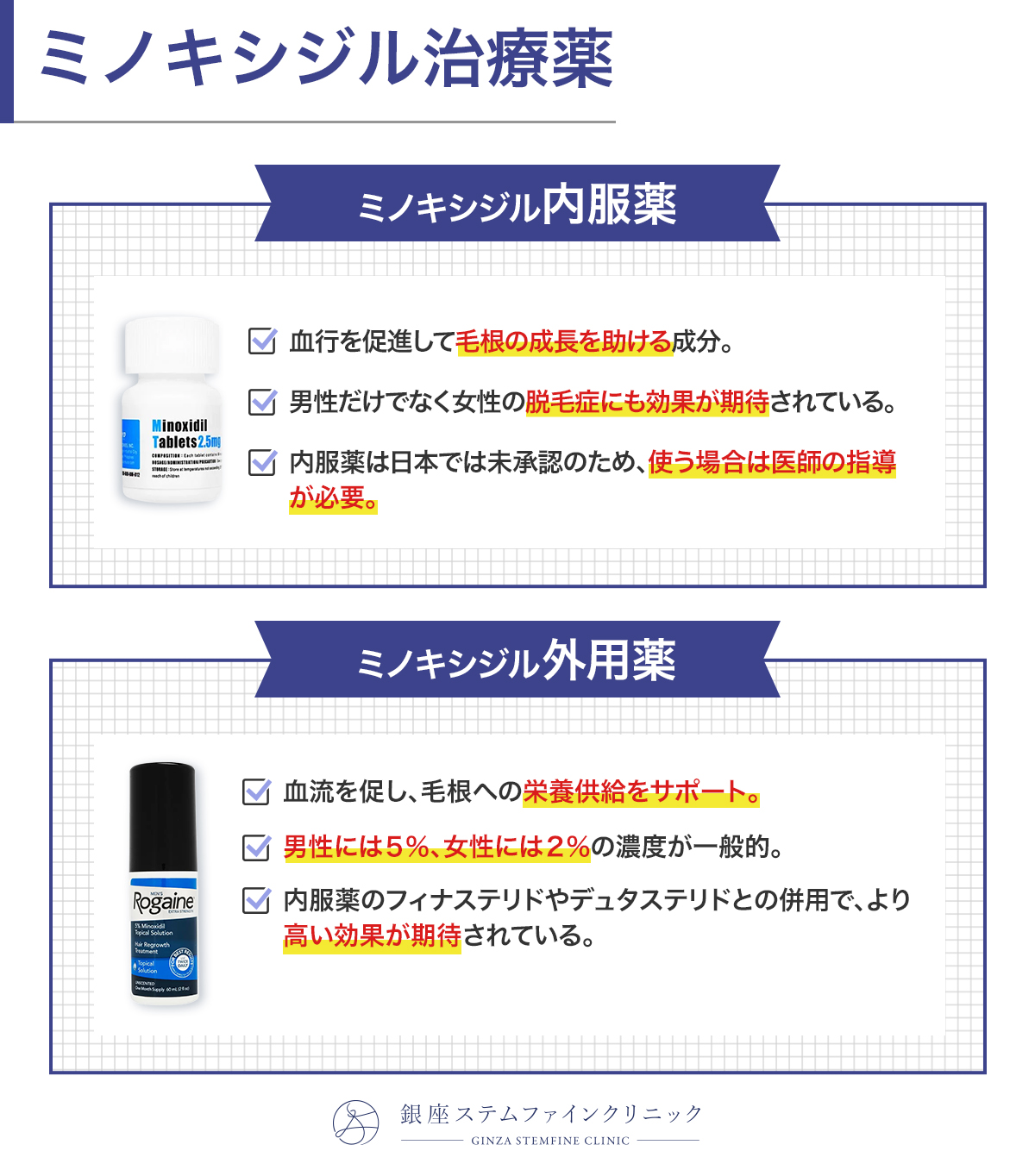 ミノキシジルには「外用薬(ぬるタイプ)」と「内服薬(飲むタイプ)」の2種類があります。