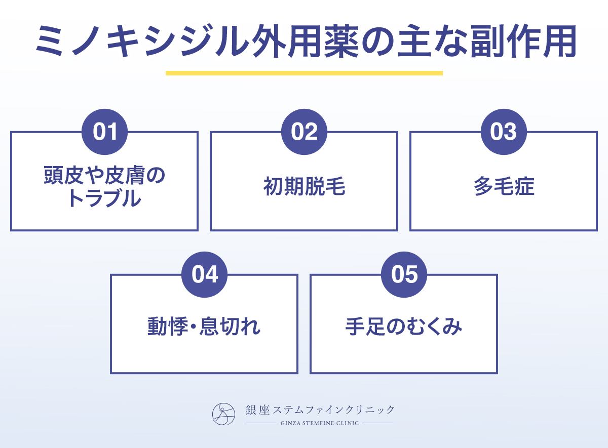 副作用については、ミノキシジル5%外用液の添付文書に、皮膚炎などの副作用が記載されています6。