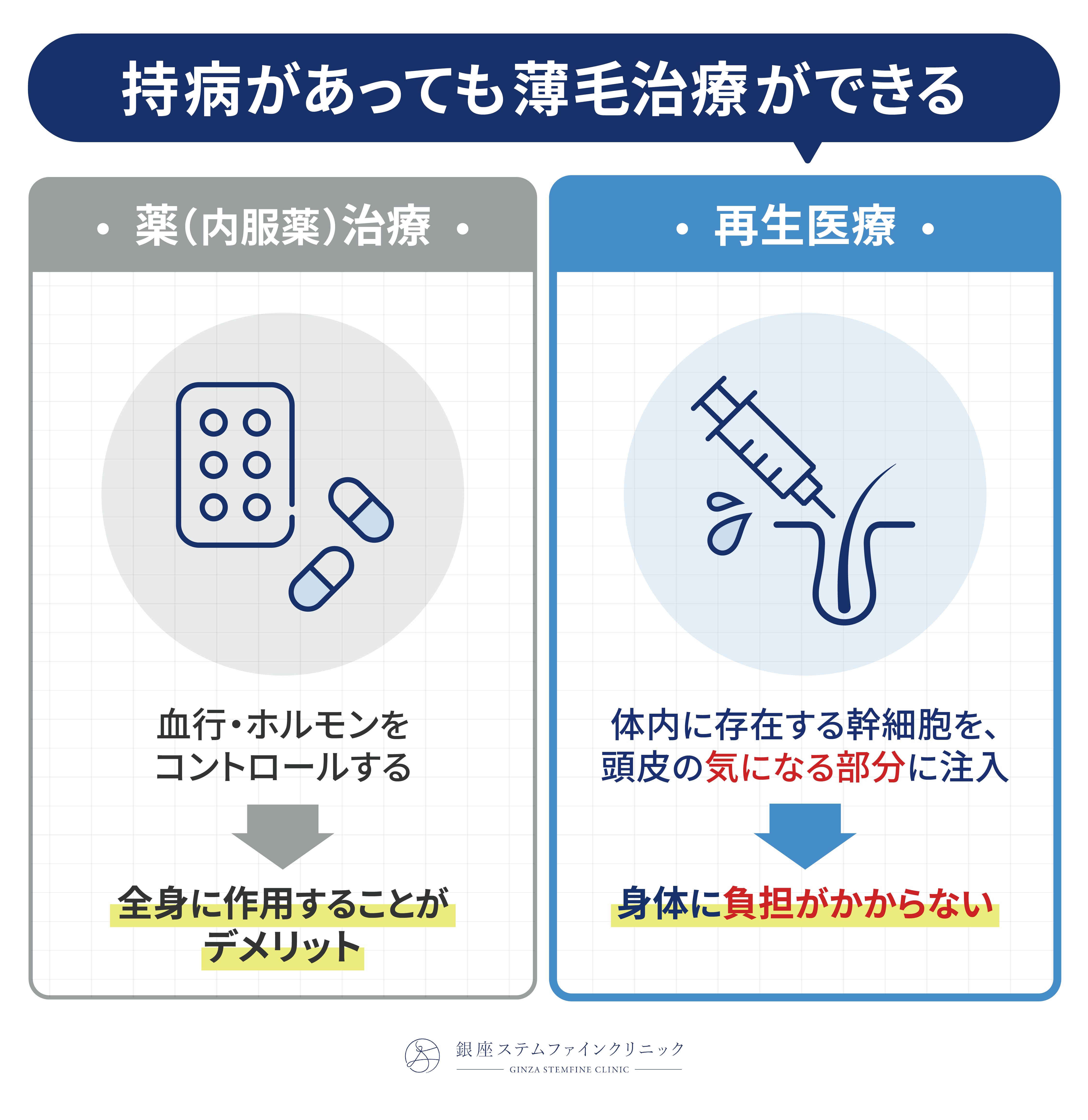 一方、毛髪再生医療は、全身に作用する内服薬とは異なり、体への負担をできるだけ抑えながら治療を行えるため、心疾患や血圧の問題、肝機能への影響などを理由に内服治療が難しかった方にも選ばれています。