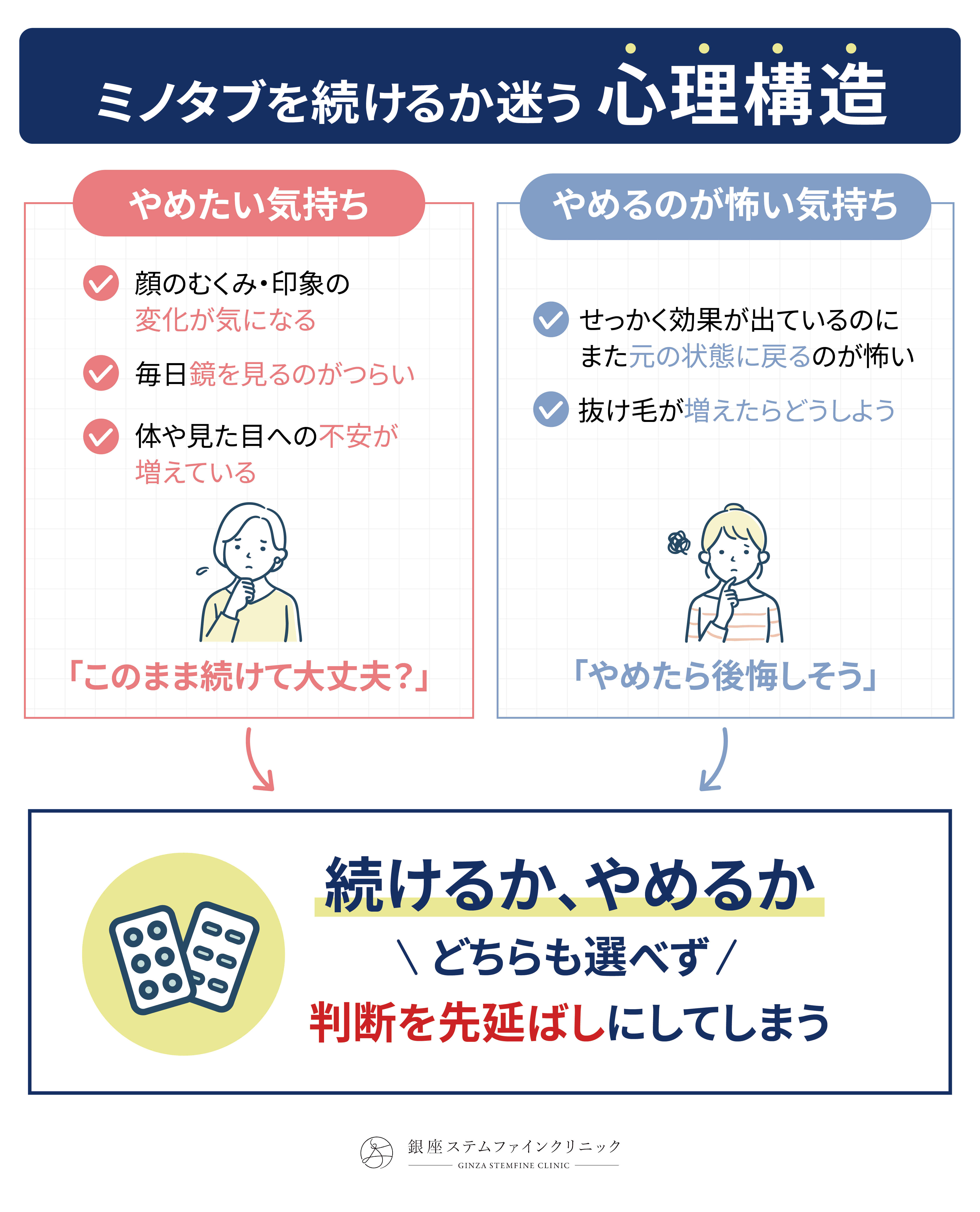 ミノタブを続けるか迷っている段階の方でも、無理に治療を勧めることはありませんので、不安や疑問がある場合はお気軽にご相談いただけます。
