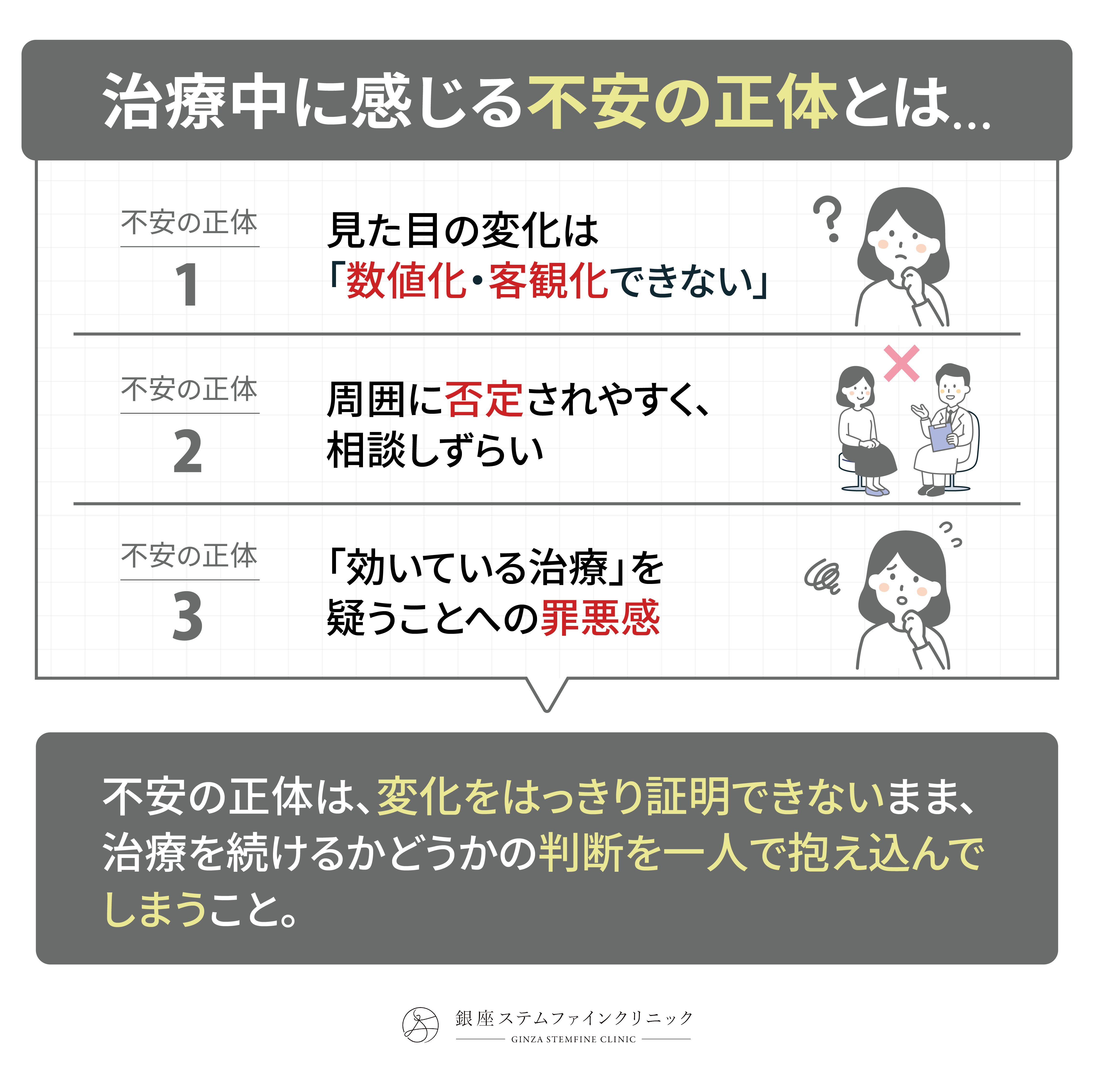 こうした不安の正体は、変化をはっきり証明できないまま、治療を続けるかどうかの判断を一人で抱え込んでしまうことにあります。