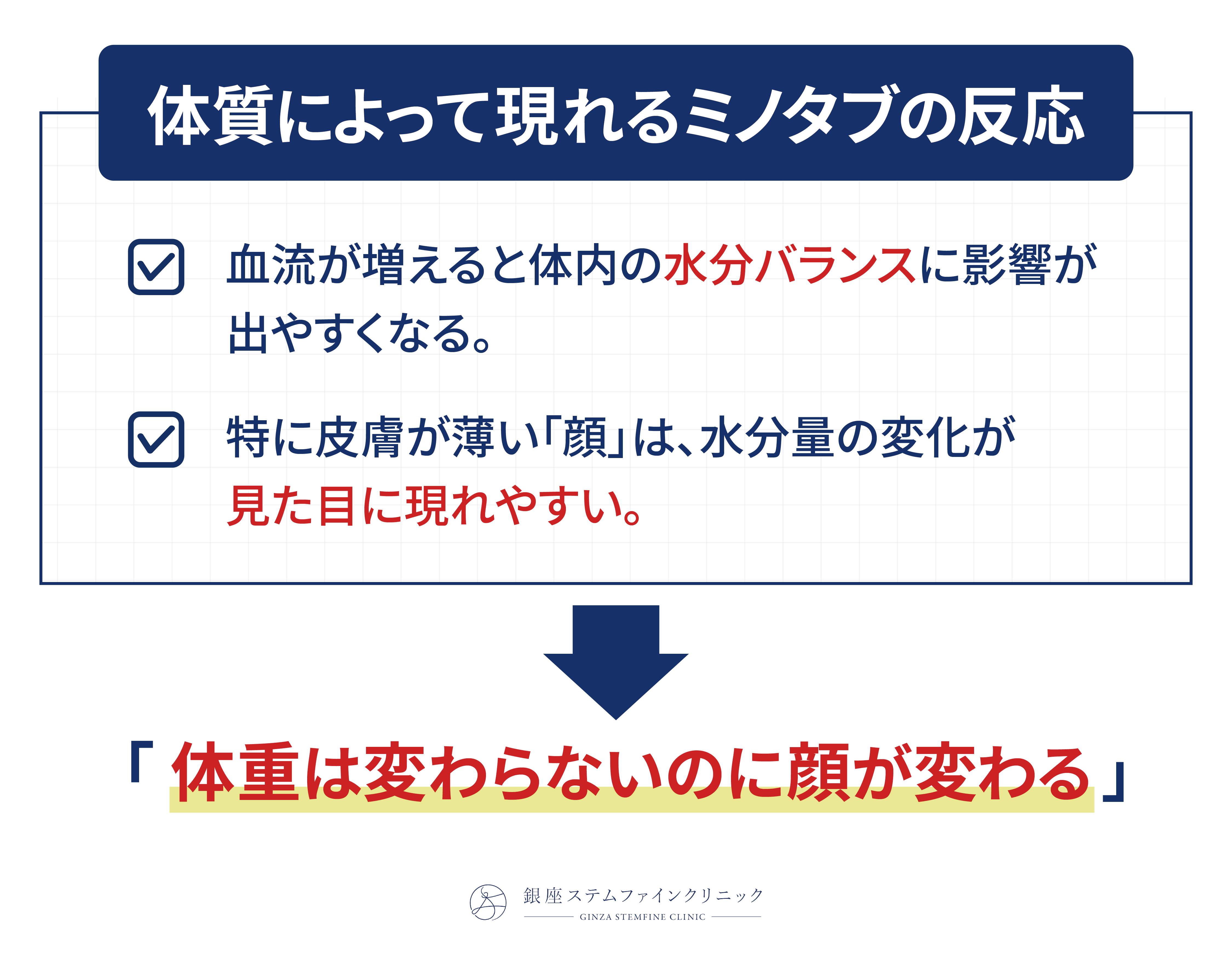 ミノタブは内服薬のため、体質によっては血流や水分バランスの変化が起こり、顔のむくみや印象の変化を感じる方がいます。