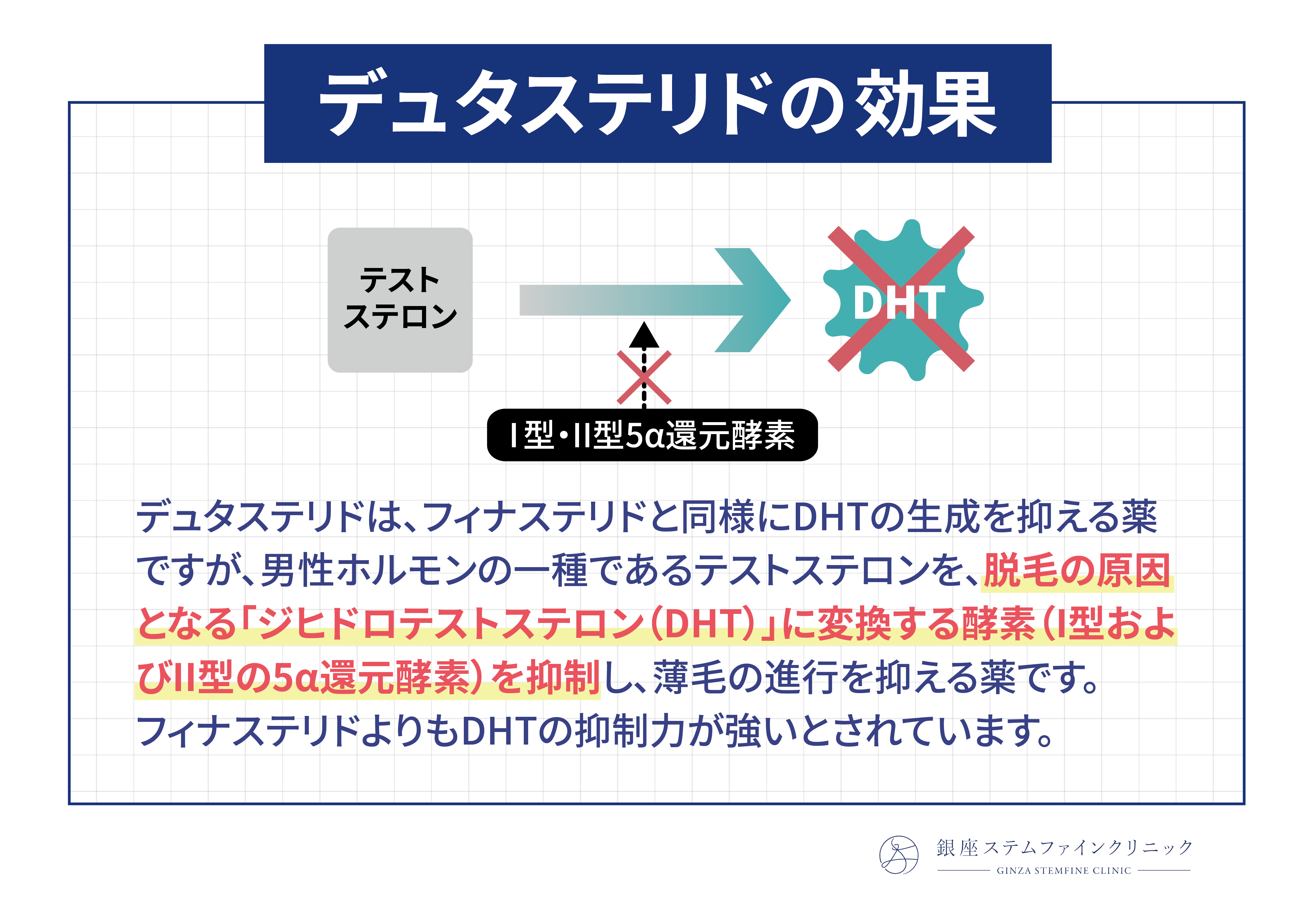 デュタステリドは、薄毛の原因物質とされるジヒドロテストステロン(DHT)の生成を抑える薬です2。