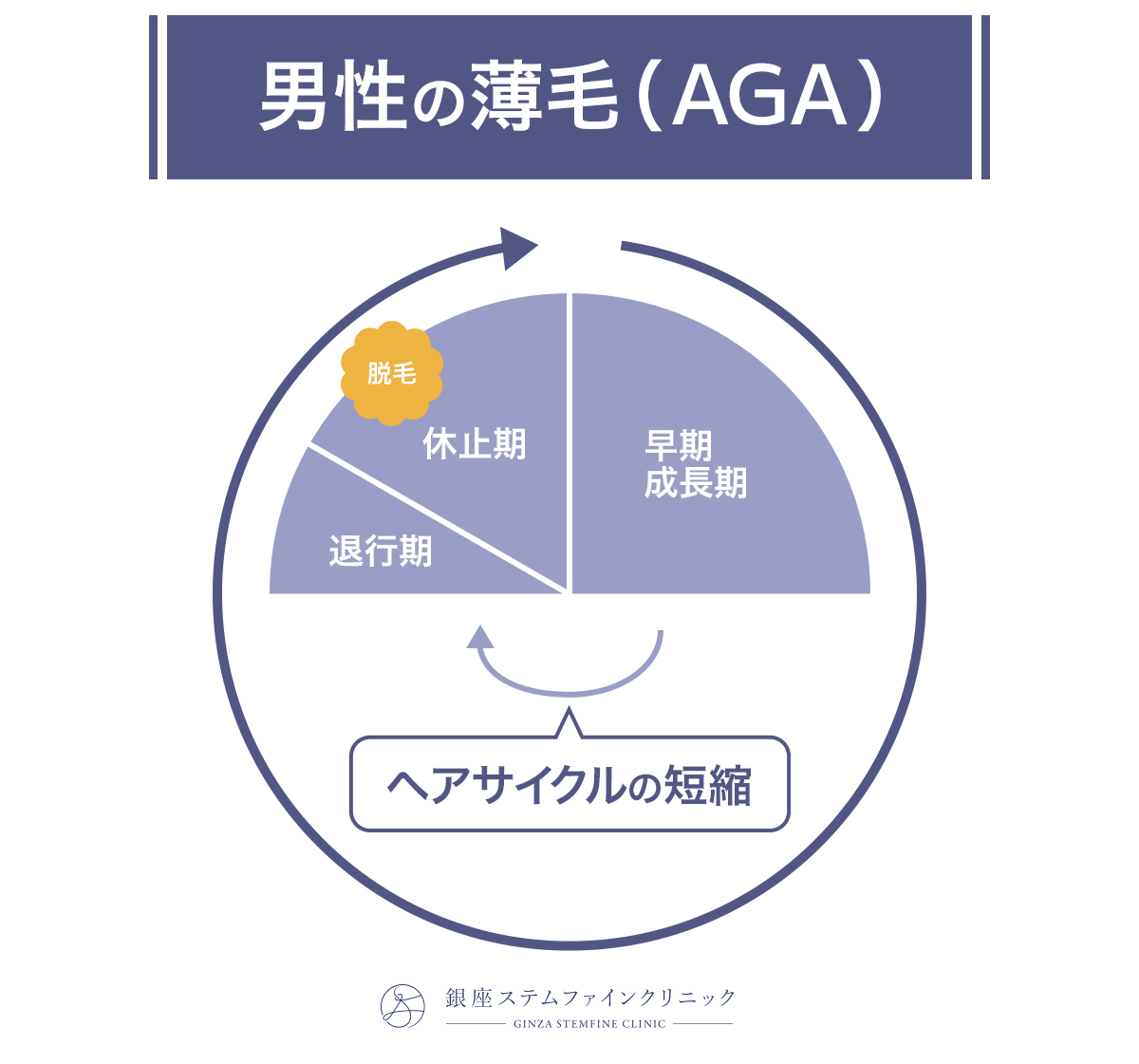 男性型脱毛症では、男性ホルモンの影響によって髪を作る力が弱まり、髪の成長期が短くなることが報告されています4。
