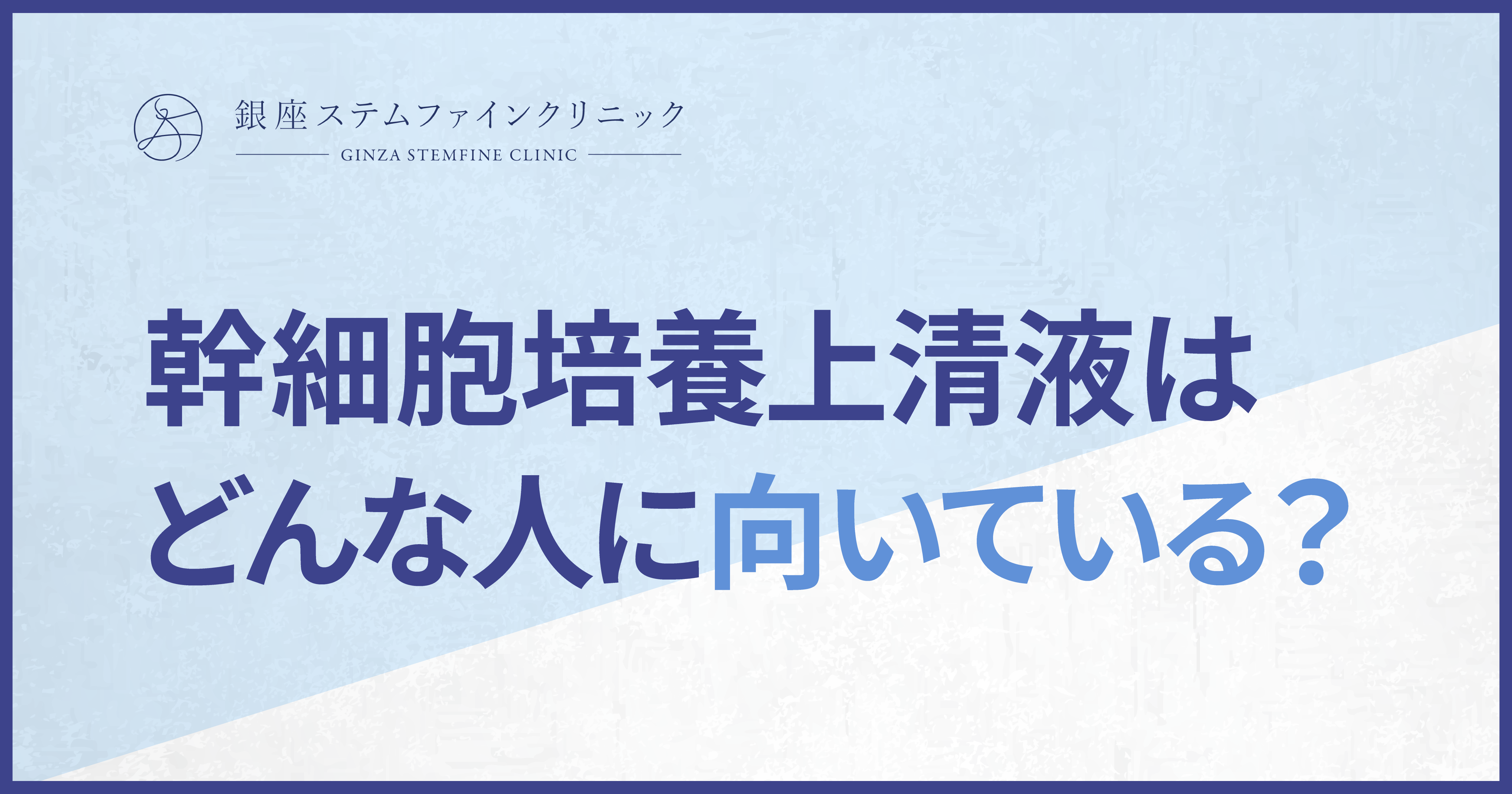 また、幹細胞治療では細胞を採取する工程が必要になることが多いのに対し、幹細胞培養上清液ではそのような処置が不要な場合が多く、取り入れやすい治療とされています。