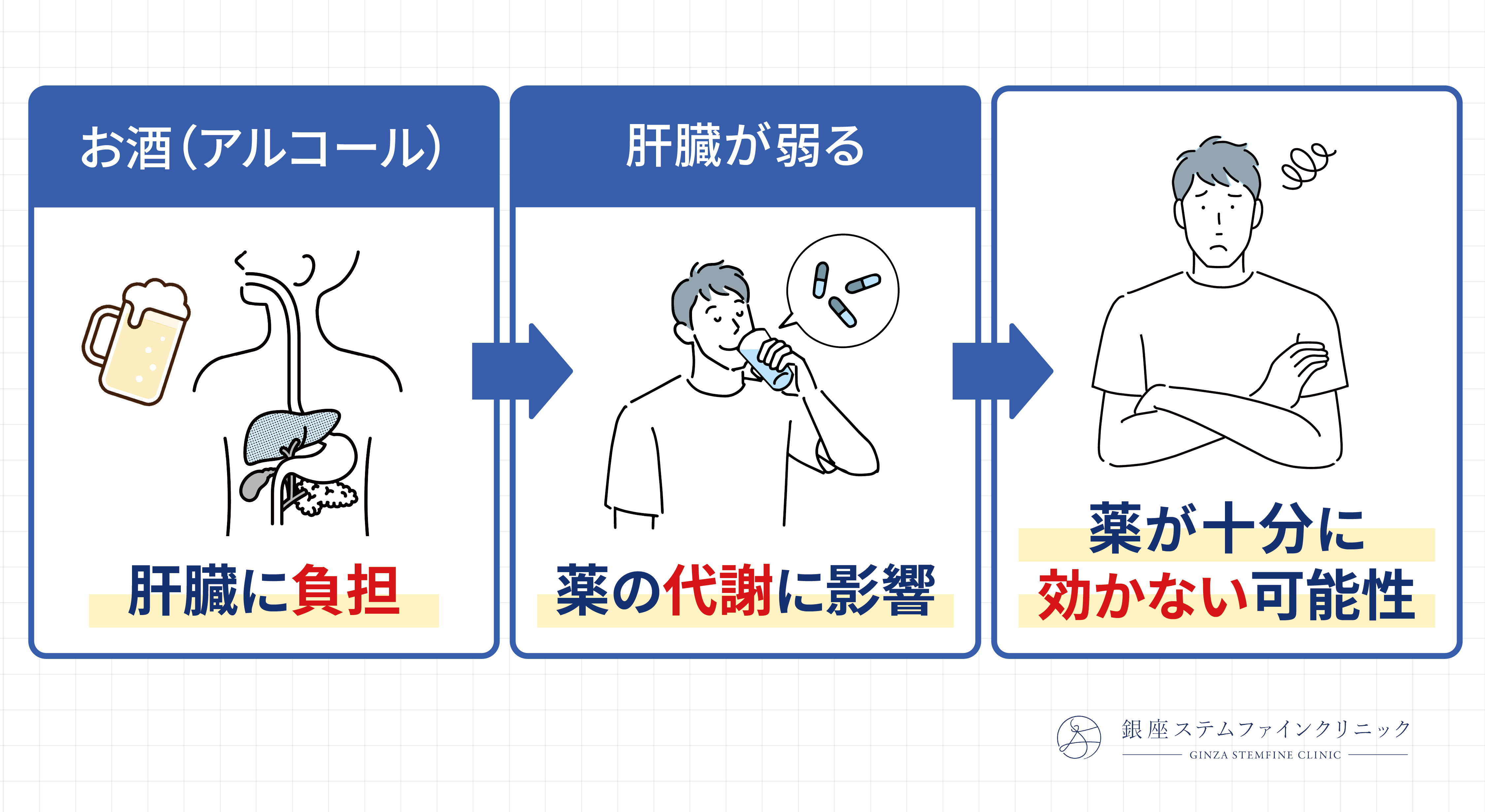 アルコールの摂取は肝臓に負担をかけ、薬剤の代謝に影響を与える可能性があるためです。
