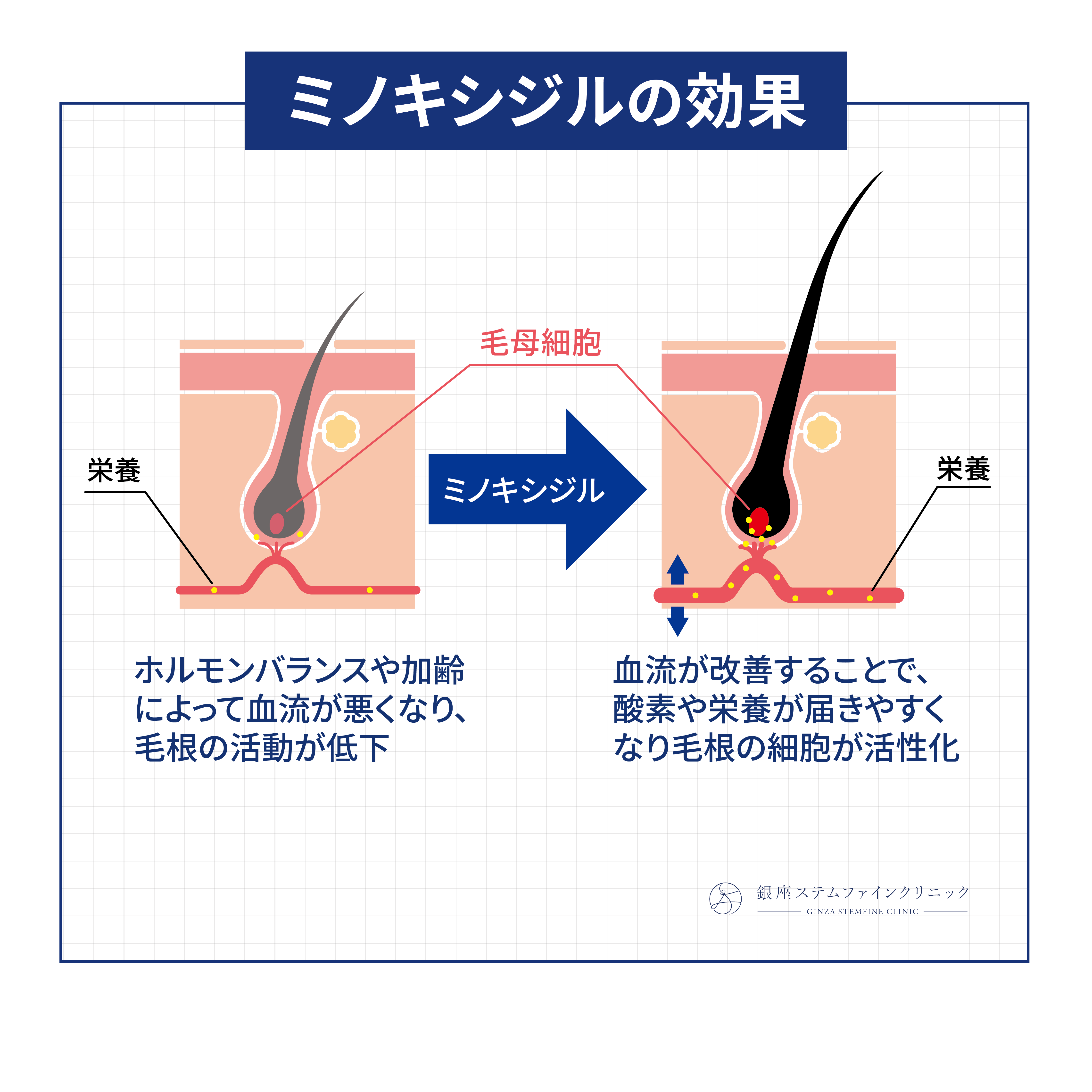 ミノキシジルには血管を拡張する作用があり、頭皮の血流を改善することで、毛根に酸素や栄養が届きやすくなります。