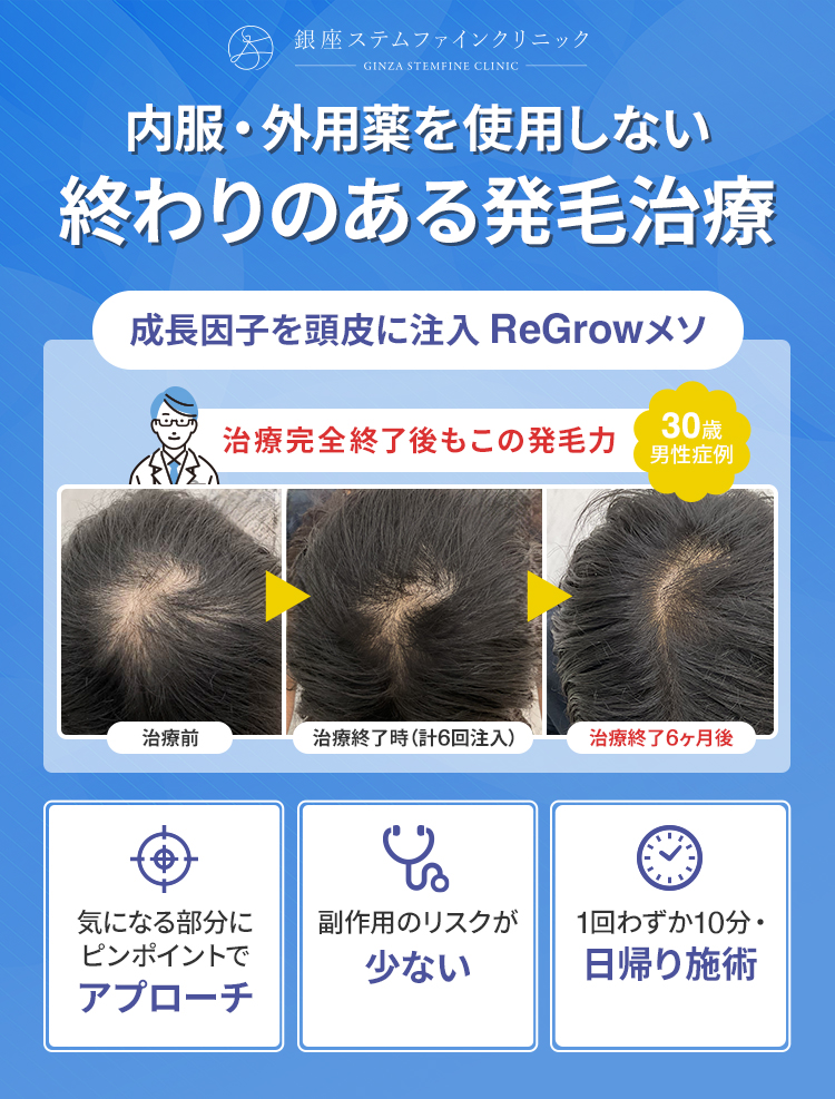 薄毛が気になる部位に対して成長因子を直接注入するため、体毛の増加を気にせず髪を成長させることができます。