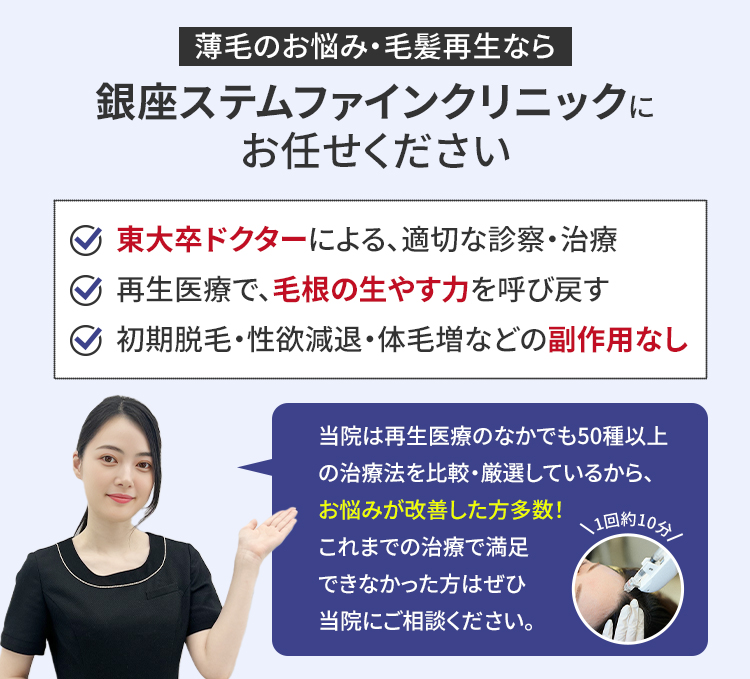 銀座ステムファインクリニックは、もう効かない治療はしたくないという方のための毛髪再生クリニックです。