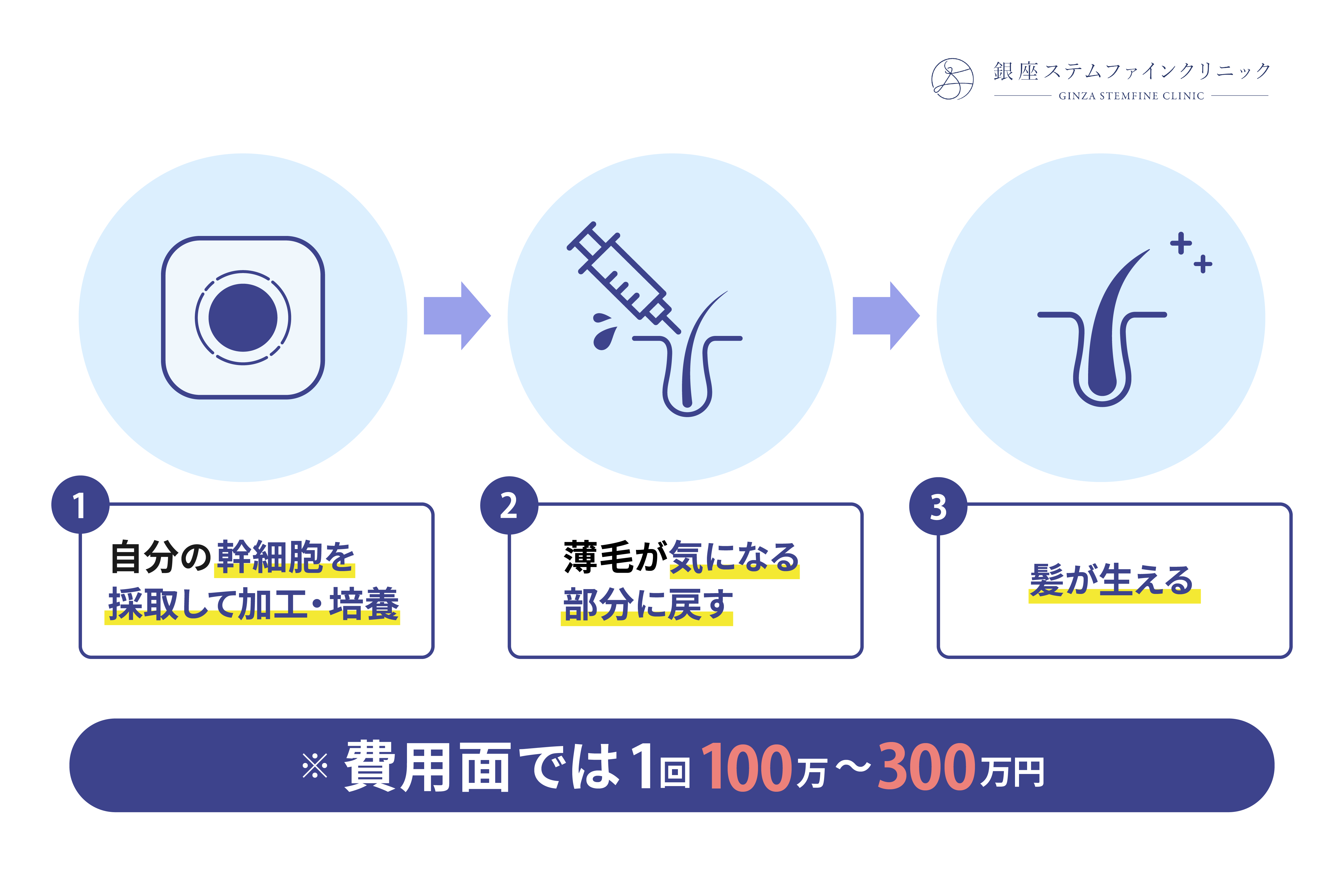この治療法は、自分の幹細胞を採取して加工・培養し、薄毛が気になる部分に戻す治療方法です。