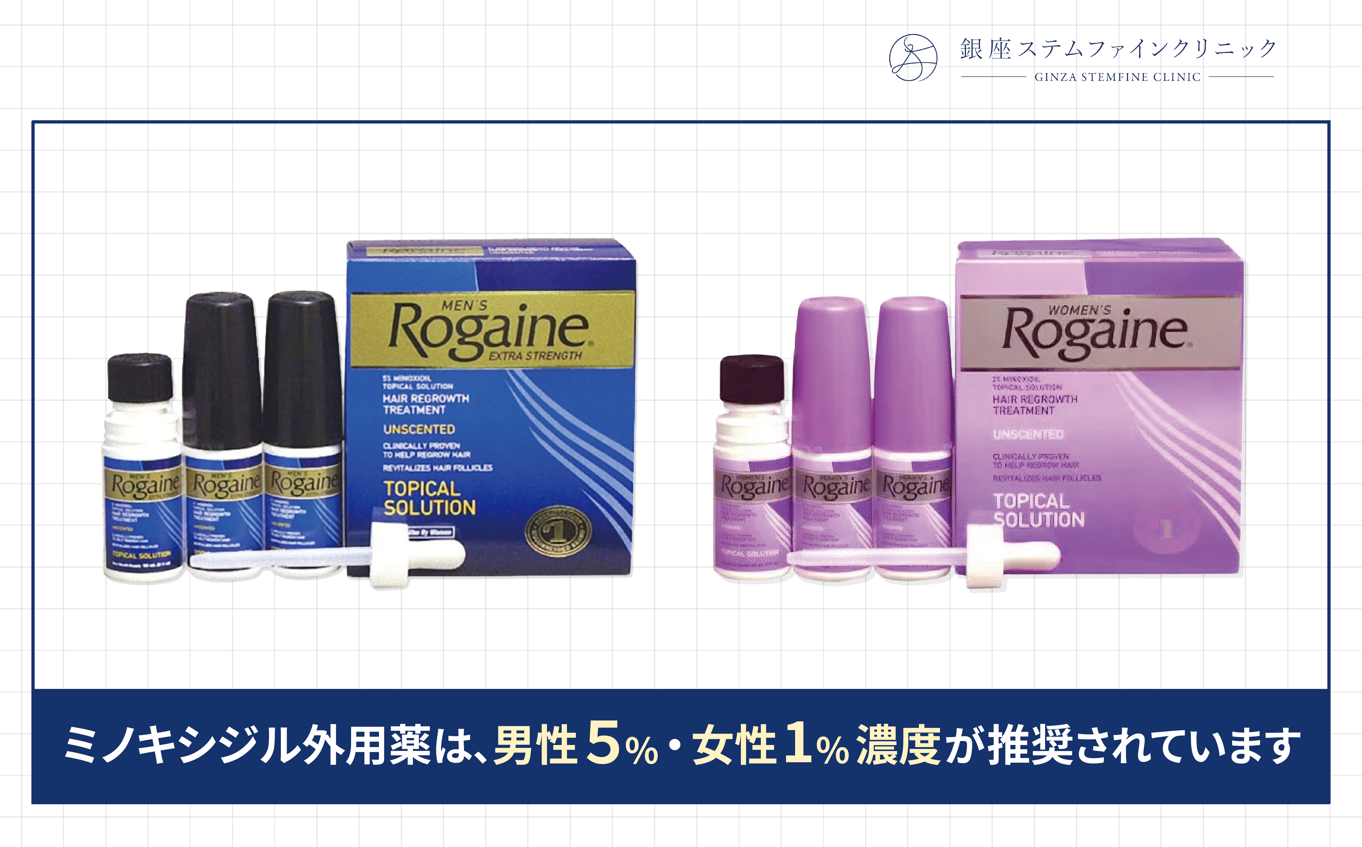 外用薬は、「脱毛の進行を抑えながら、発毛も促す」というダブルの効果が期待され、男性には5%、女性には、低濃度(1%)の外用薬が安全性に配慮された設計で販売されています。