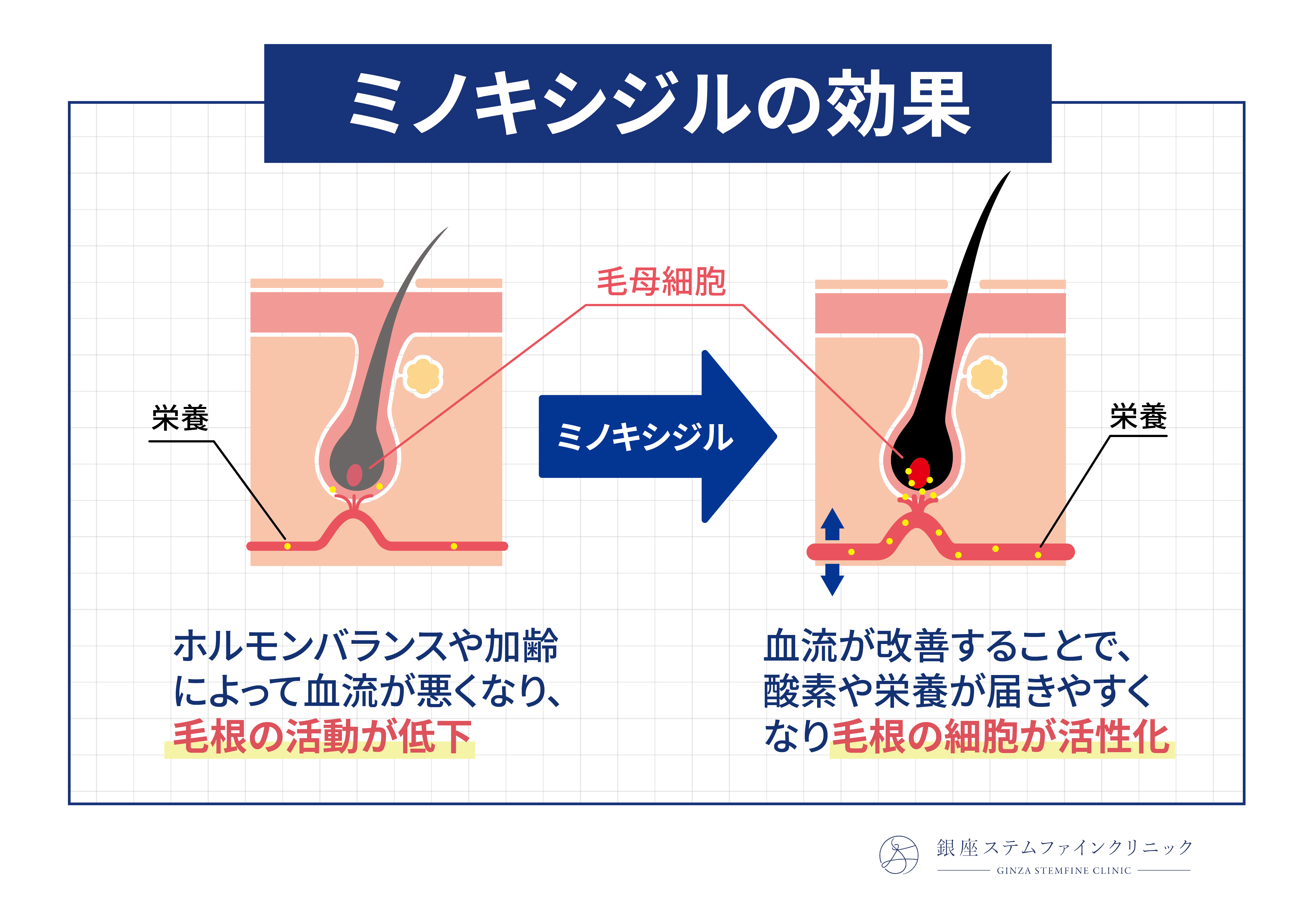 一方ミノキシジルは、DHTの働きに関係せず、頭皮の血管を広げて血流を促進することで髪のもととなる毛母細胞に栄養を届け、発毛環境を整える作用があります24。