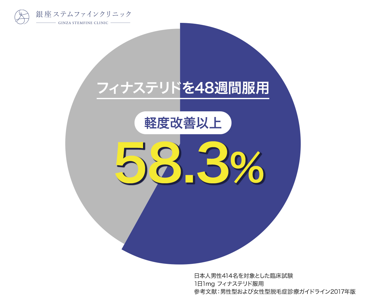 たとえば、日本人男性414名を対象とした48週間の臨床試験では、1日1mgのフィナステリドを服用したグループの58.3%が「軽度改善以上」と評価されました7。