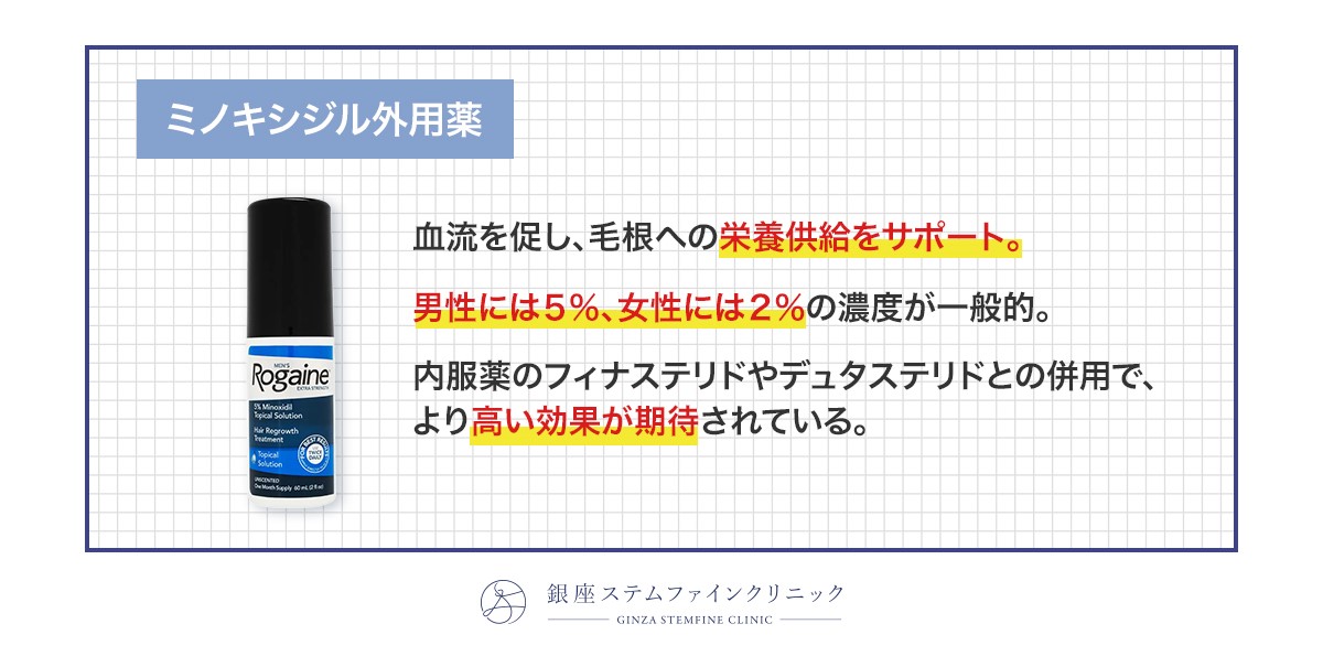 外用タイプのミノキシジルは、血行を促進し、髪の毛の成長をサポートする治療薬です。