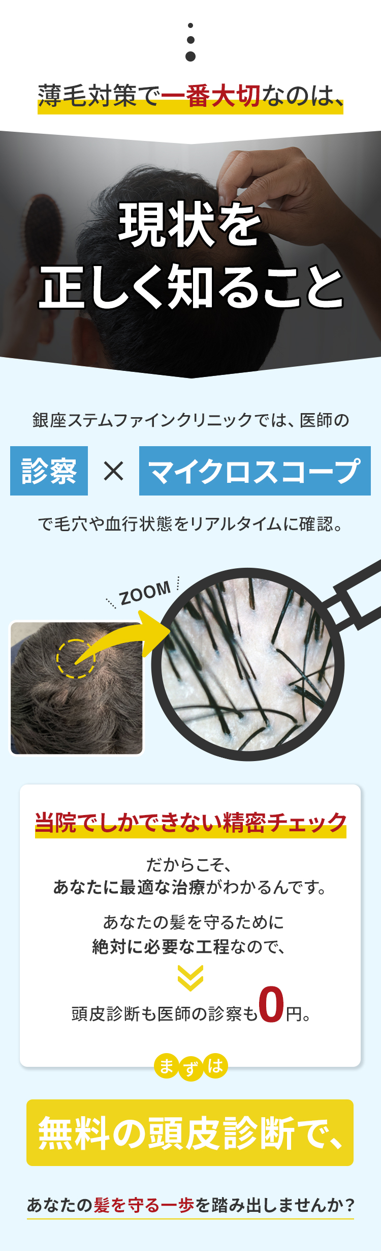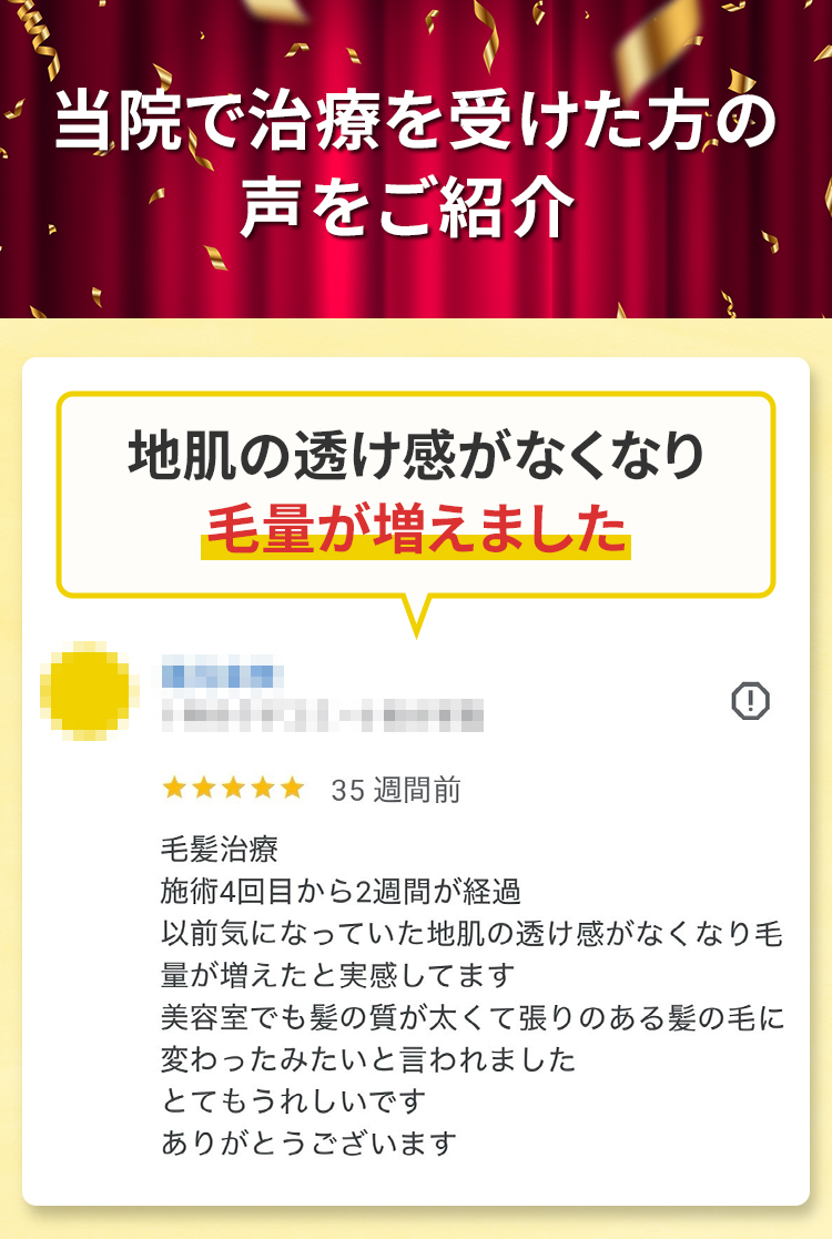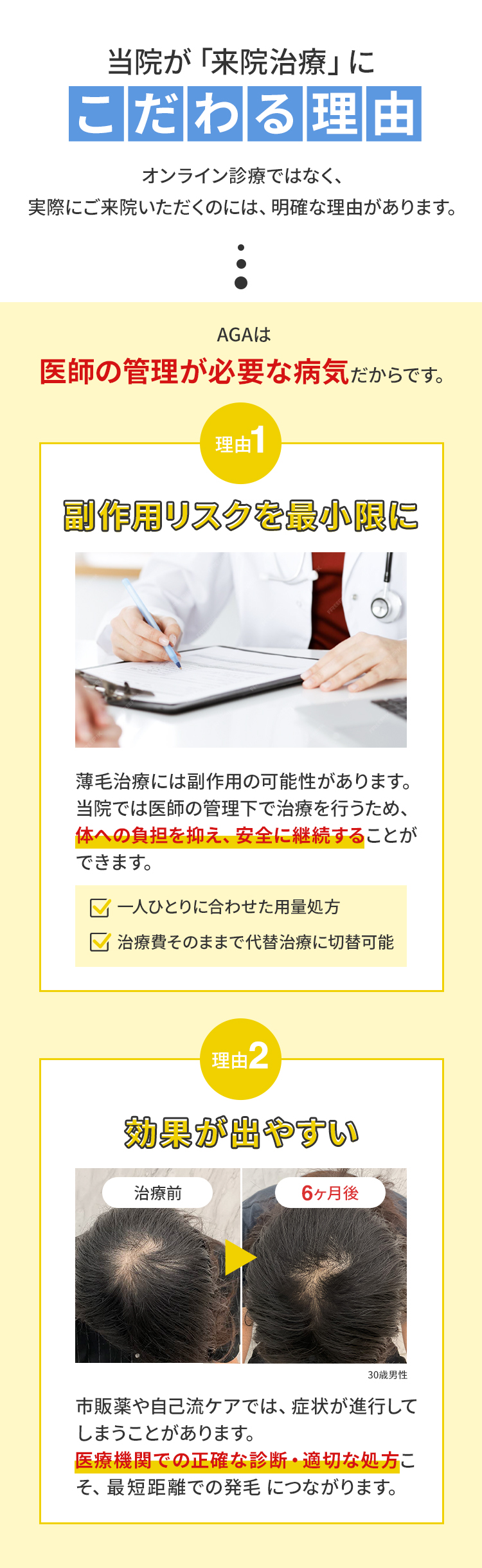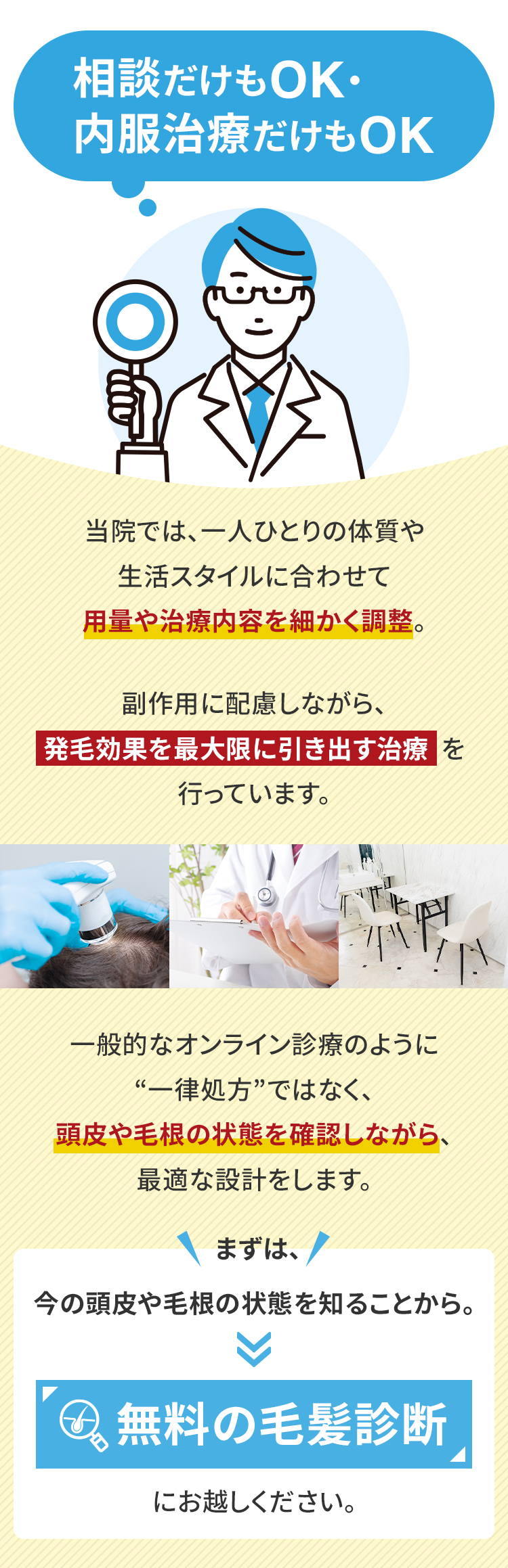 発毛の進行や小さな変化も見逃さず、必要があれば最小量の調整や代替治療の提案も対応します。