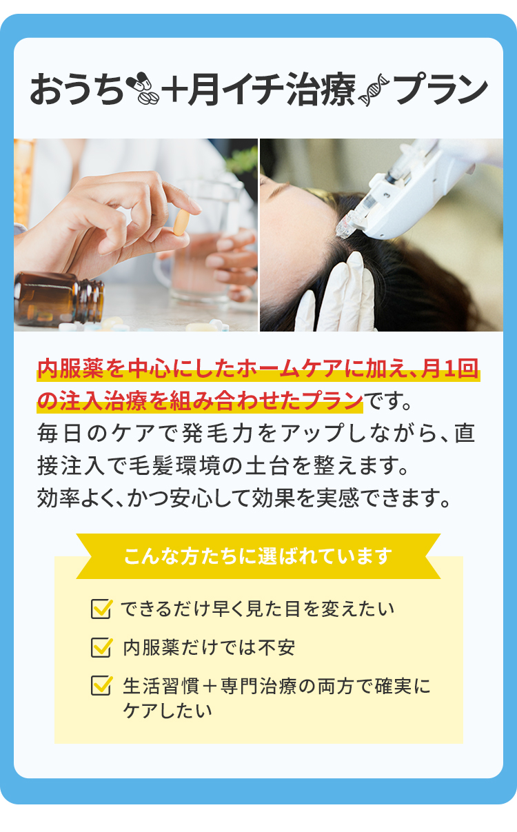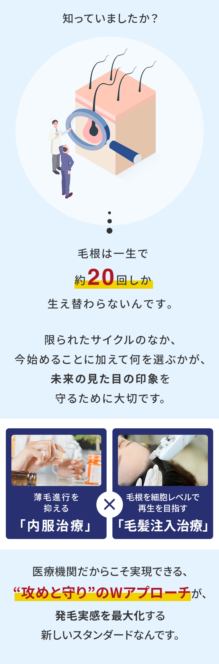内服は“毛を生やす力”を、注入は“毛根の環境を整える力”を高めます。