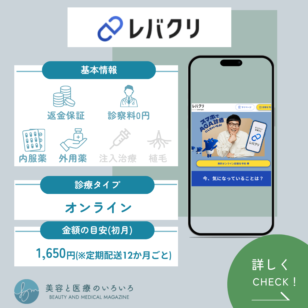 | レバクリ | オンライン | 1,650円 (フィナステリド、 ミノキシジル内服) ※定期配送12か月ごと |