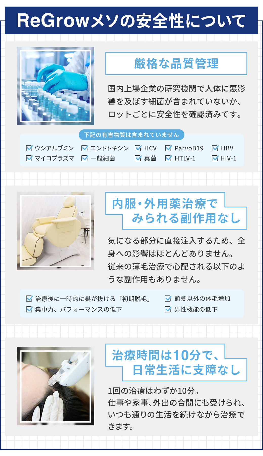 当院では、髪を生やすことだけでなく、治療に伴う副作用への配慮を重視し、デメリットを最小限に抑えた再生医療を採用しています。